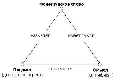 Не останавливаясь на подробном рассмотрении всех перечисленных концепций, отметим только, что первая из них, наиболее старая, представляет значение как отнесенность слова к объекту (референцию): “слово называет вещи”, между именем и обозначаемым предметом существуют достаточно прямые отношения. Собственное имя связывается с одним объектом, нарицательное — с кругом объектов, глагол называет действия, прилагательные и наречия — свойства объектов и действий, предлоги отражают отношения между объектами. Представления подобного рода получили название номинативной парадигмы. На пути решения трудностей номинативной парадигмы возникла точка зрения, согласно которой слово соотносится не только с предметом, но и с определенным умственным содержанием. Эта идея нашла свое наглядное воплощение в “семантическом треугольнике”, или треугольнике Фреге (рис. 14). Представленный на рисунке комплекс — три элемента и связи между ними — образует слово языка.